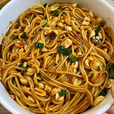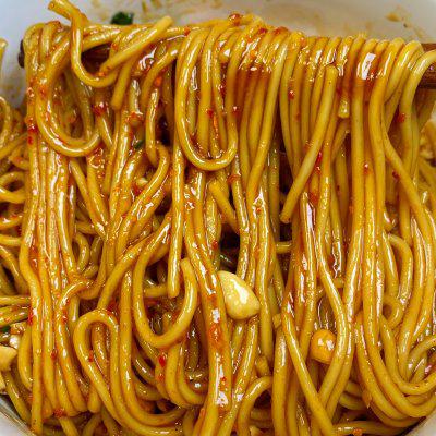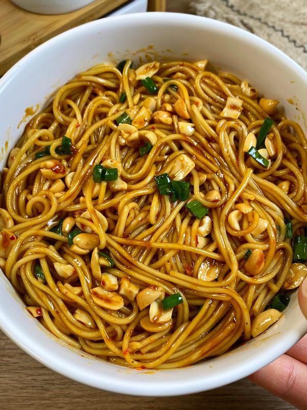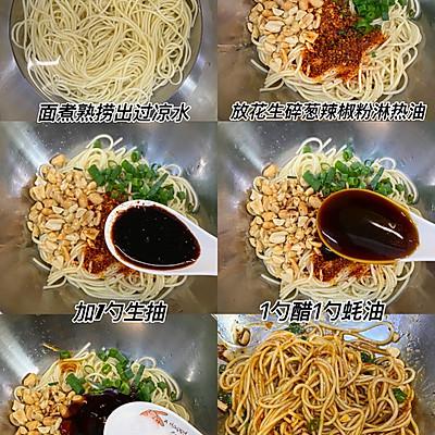 2、做法: 1️⃣将面条煮熟捞出,放入盆中放入冷水。 2️⃣加入葱花辣椒面花生碎热油, 1 勺生抽 1 勺醋 1 勺子耗油,少量糖和鸡精拌匀即可食用。
