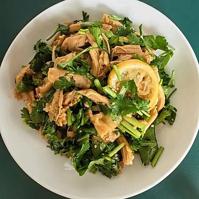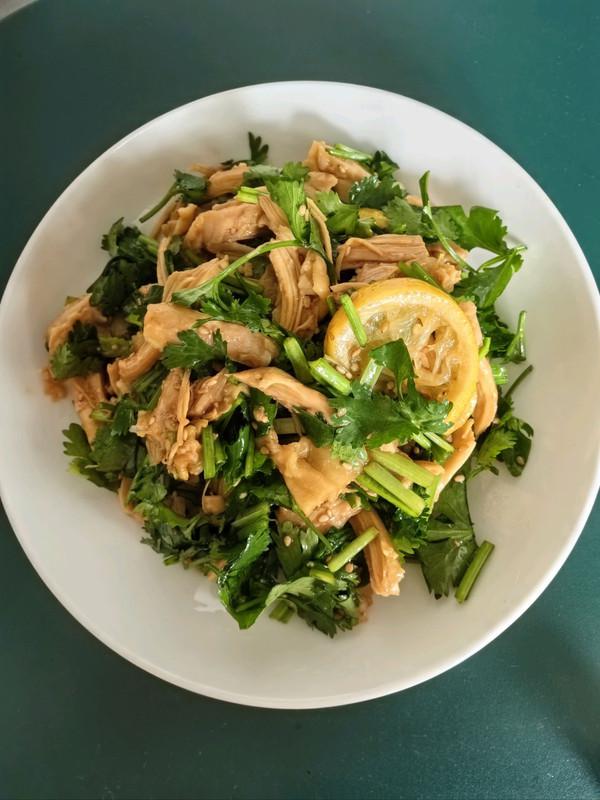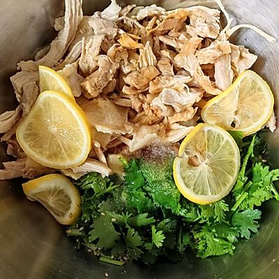 2、将香莱、柠檬全部切好,放入撕好的鸡肉中,倒入一些芝麻油、芝麻、酱油、糖搅拌均匀,放入盘中。