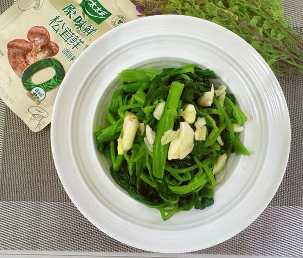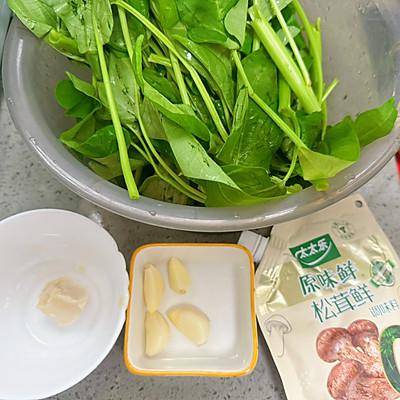 2、准备好原料,空心菜采摘,放入盆中,大蒜剥皮,猪油挖一勺,提前准备好太太乐原味鲜松茸鲜。