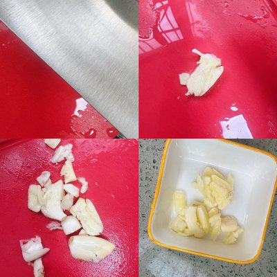 4、拍摄大蒜,用菜刀刀背用力拍摄不需要切割,拍摄大蒜备用。