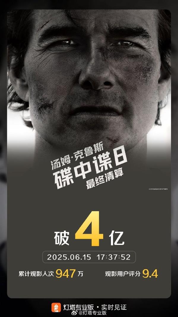 快科技 6 月 16 每日新闻,根据灯塔专业版的实时动态,截至 6 月 15 日 17 时 37 分,电影《碟中谍》 8:票房突破的最终清算 4 亿。