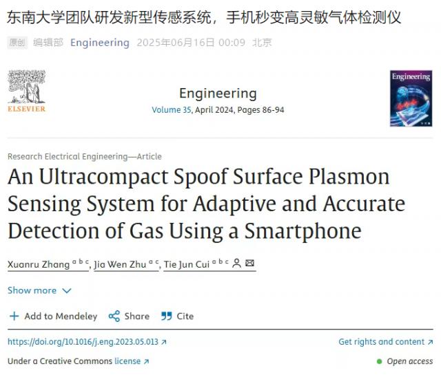 IT 世家 6 月 16 日消息,中国工程院院刊《Engineering》今日发文,崔铁军教授团队在东南大学毫米波国家重点实验室发表了题为“ An Ultracompact Spoof Surface Plasmon Sensing System for Adaptive and Accurate Detection of Gas Using a Smartphone "(微型人工表面等离激元传感系统) —— 研究论文,实现自适应性和高精度气体检测),报道了无线微波人工表面等离激元传感系统,超微型、高灵敏度、高精度、智能化,并验证了其在甲苯蒸汽传感中的应用。东南大学副研究员张璇是论文第一作者,崔铁军教授是通讯作者。