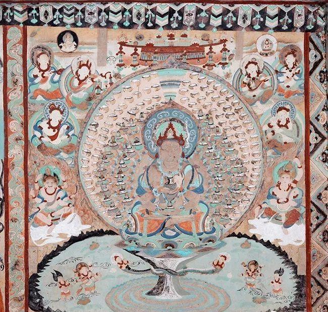文殊菩萨在第361窟东壁南侧坐在荷花台上。身着璎珞和天衣的文殊菩萨,戴着宝冠,冠上化佛,圆头光上有华盖。壁画画的结构就像一座须弥山。华盖上下分别是坐五只鹅的月藏菩萨和坐五马的日藏菩萨。千臂文殊的身体正好在须弥山的中心,仿佛整个文殊菩萨的身体就是庞大的须弥山——世界的中心。很明显,只有有了“土生土长”的世界观,才能同时观察须弥山和文殊菩萨,才能在须弥山上全面描绘千臂千钵文殊菩萨,从而在法界形成所有虚空都是文殊论的表达。