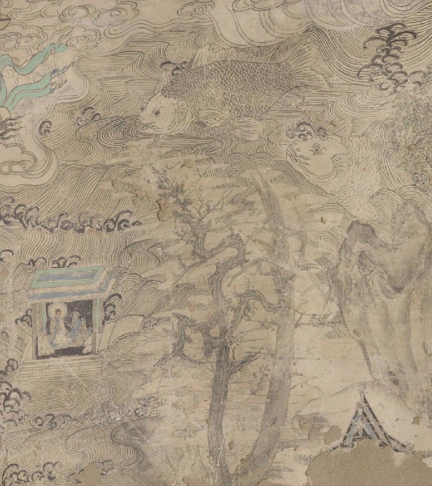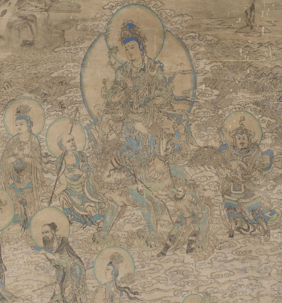 峨冠博带的帝释,威武的天王,优雅的菩萨,天真无邪的男孩,有条不紊地围绕着菩萨,在云海和浪涛上享受,一起旅行。右下角有两条大鱼跃出水面,代表着不畏惧、不放弃、敢于乘风破浪的精神。事实上,它们代表了中华文化中鱼跃鸢飞的精神境界。在不远处的海上,船船向前走去,四个人正围着一个和尚听着佛法,完全忘记了汹涌的大海。或许,这也是文殊菩萨想要传达的精神:无论在什么环境下,致力于当下的事情,完全无私,完全在一起,完全相处,都是渡海渡劫的方式。