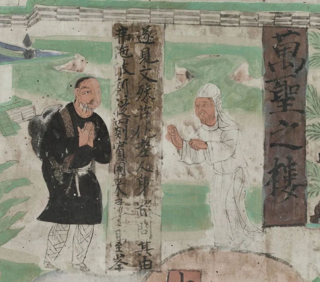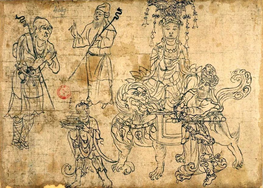 在现藏法国图书馆敦煌藏经洞出土的白描中,还有佛陀波利和文殊菩萨的长者形象。老人戴着风帽,穿着长衫,留着长胡子,弯着胳膊,左手做着说法的姿势,左手拿着拐杖,像一个汉地的长辈。他和佛陀波利说话的表情非常生动,充满了同情心。佛陀波利是一个老胡僧,右肩挂着竹帽,腰上系着一个瓶子,胸前放着一根拐杖,双手合十,眉毛长,穿着一件紧身长袍,裹着腿,像一个远行者,正在向文殊老人致敬。