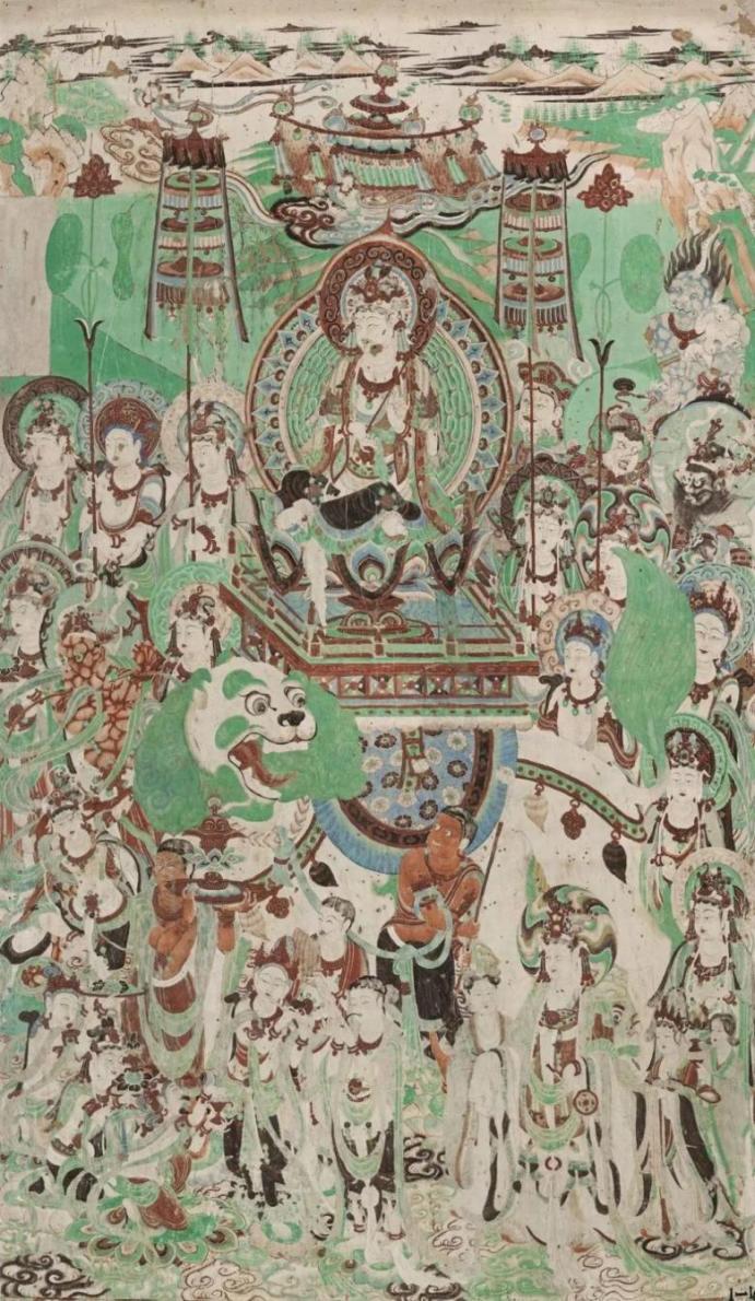 这位男相文殊自由地坐在青狮上的莲座上,一只手长得如意,另一只手喊着指纹,眉毛和眼睛弯曲,嘴唇微微移动。三根绿胡子在画面中央衬托出文殊亲近的笑容。莲座下方的鞍座和文殊菩萨的背光和头光,菩萨两侧的经典建筑,头顶的华盖,狮子身上的圆弧色毛毡,共同构成了稳定的视觉效果。头光背后连绵不断的群山预示着现实中的五台山;白色的青狮子,睁着眼睛的昆仑奴,手里拿着贡品的幸运男孩,天龙八部,伎乐菩萨,供养菩萨等。,不仅突出了中央的文殊菩萨,也向每个个体传达了成千上万的意态。
