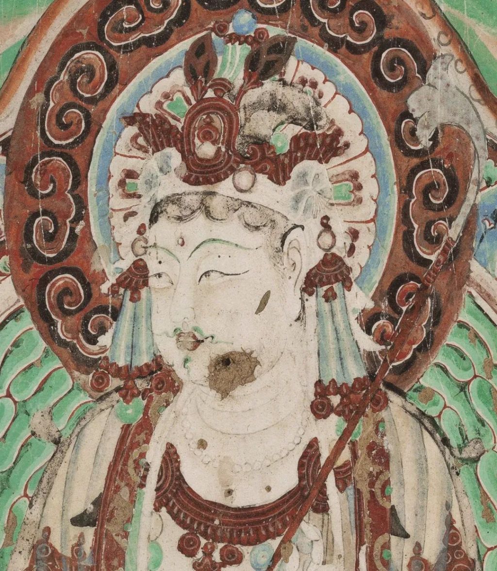 张大千曾经模仿敦煌的剑菩萨,刚劲强悍的菩萨,右手拿着剑,左手拿着火。光靠剑是不能确定是不是文殊菩萨的,因为虚空藏菩萨也拿着宝刀。那么敦煌的文殊菩萨有宝刀吗?当然有!