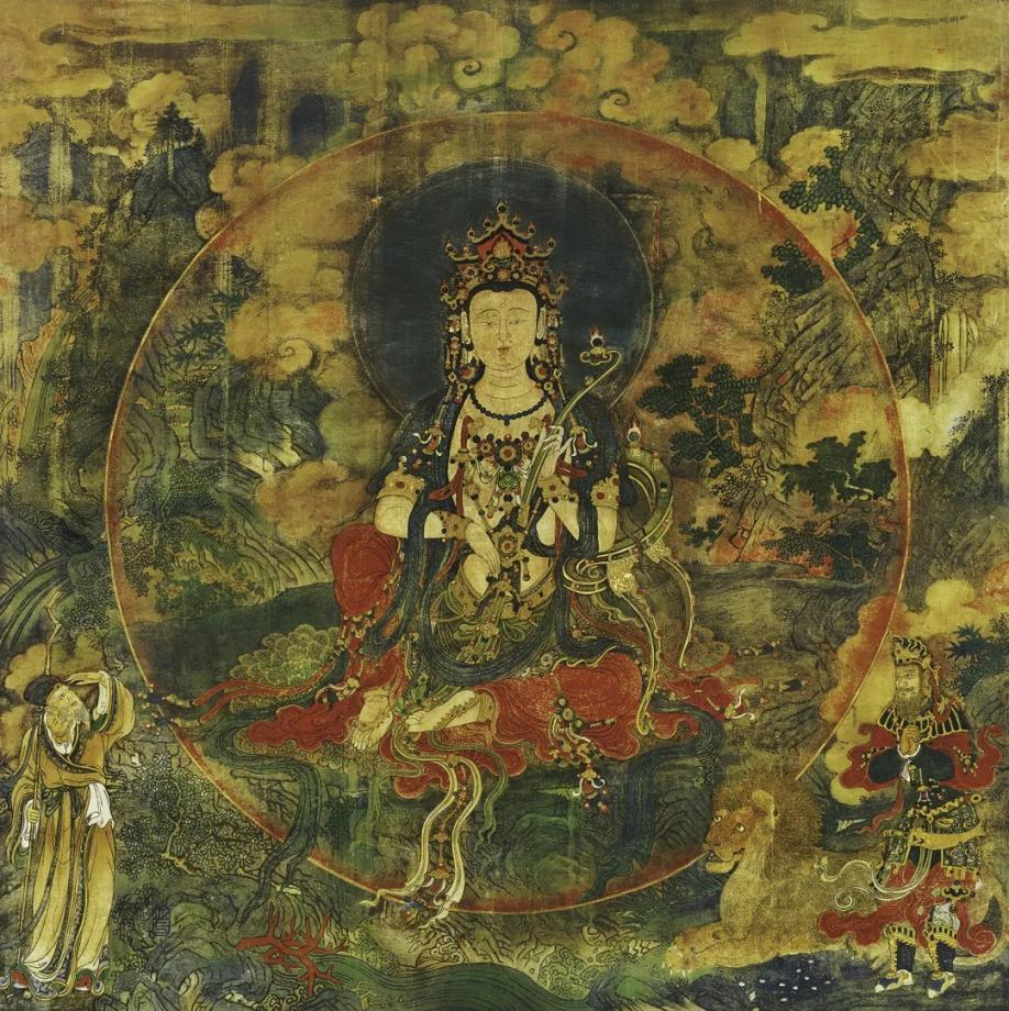 这位文殊菩萨手持如意,目光专注,表情庄重,形象优雅沉着,头光和身光和青毛狮雄壮的身材凸显了菩萨的威严和勇敢。狮子足踏红莲,驭狮人是络腮胡子之王,肘部肌肉清晰可见。有意思的是,在文殊菩萨的右下角,有一个塞北僧人,拄着杖头,托着碗,仰望菩萨。这就是佛陀波利,佛陀的传播者,佛陀的圣经。在佛陀波利的下面,是一位左手拿着经书的老人文殊,他的眼睛殷切,皱纹苍老,仿佛世界上所有的苦难都已经被真正理解,而答案似乎就在他手中的佛经里。