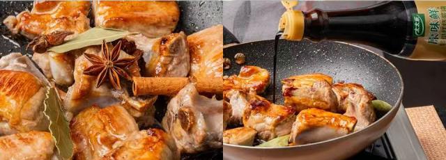 3. 加入八角、桂皮、香叶调味,倒入红烧酱油着色。