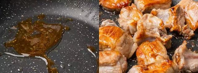 2. 锅内烧油,小火将冰糖炒至焦糖色,加入排骨翻炒。