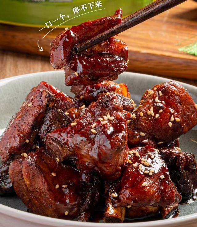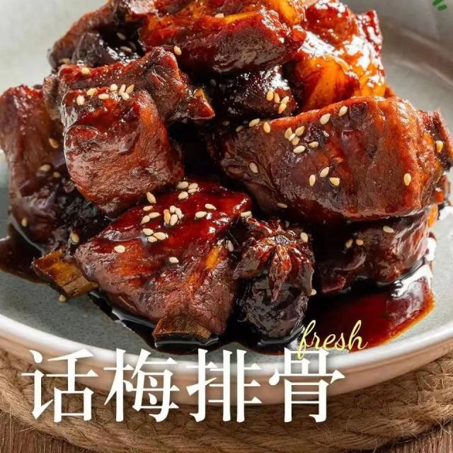 猪肋排 500 克、话梅 5 颗、冰糖 20 克、米醋 15 mL、芝麻 5 克、黄酒 20 mL、鸡精 5 克,红烧酱油 15 mL