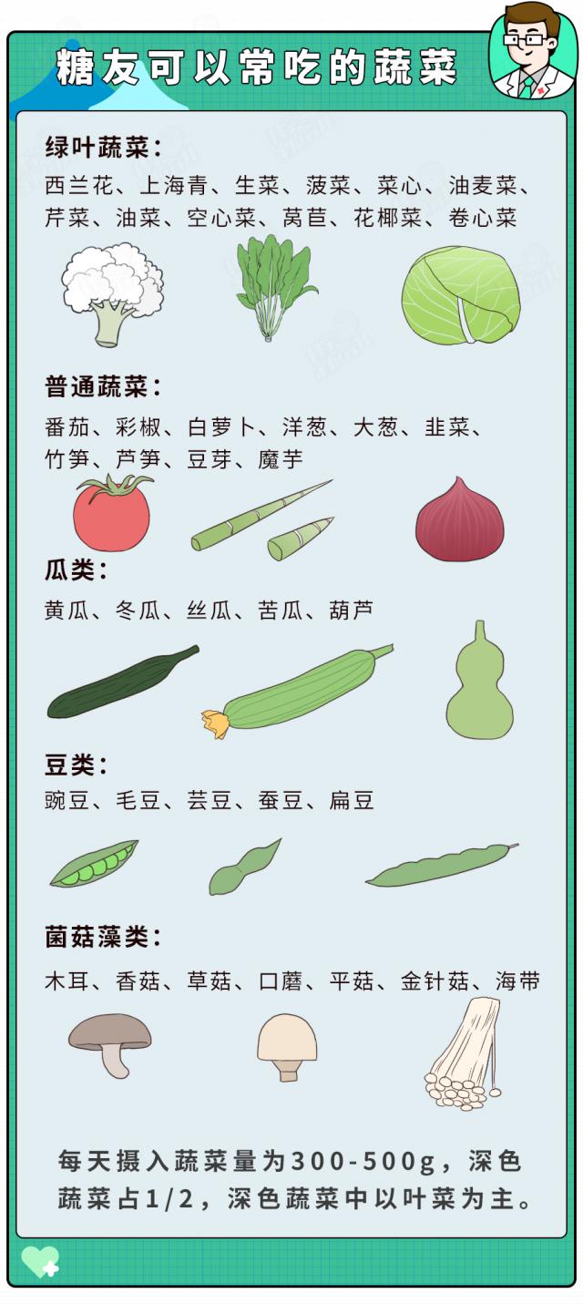 接下来我们来看看,可以多吃一些非淀粉类蔬菜:青菜、普通蔬菜、瓜类、豆类、菌类藻类。
