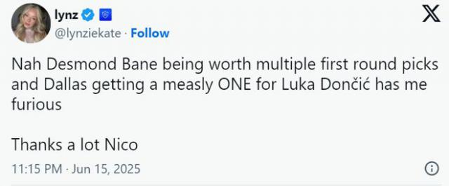 独行侠球迷 Lynz “呵呵,德斯蒙德 - 贝恩可以换几个首轮签,而独行侠拿卢卡。 - 但是东契奇只换了一个可怜的第一轮签,这让我很生气。尼科,非常感谢!”
