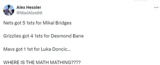 球迷 Hessler 写道:“篮网换成了布里奇斯 5 第一轮,灰熊用贝恩换来的。 4 第一轮,独行侠用东契奇换来的。 1 第一轮,数学在哪里?”