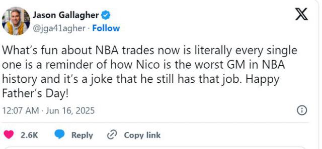 新闻人 Gallagher “现在,”写道 NBA 交易的乐趣在于,几乎每一笔交易都让人想起尼科(哈里森)。 NBA 历史上最糟糕的总经理,而他竟然还在做这份工作,简直是个笑话。父亲节快乐!”