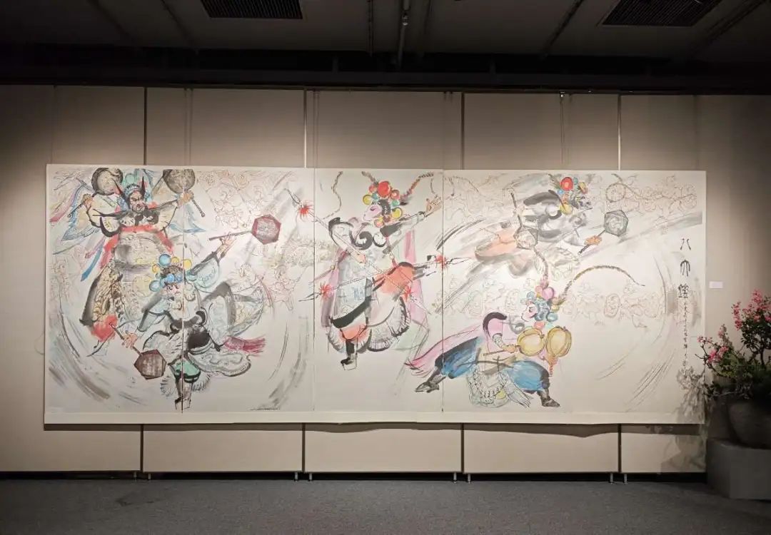 走进展厅,一幅六米长的《水漫金山》首先映入眼帘。在2.20米的尺度间,青白蛇破绢而出,十八罗汉的泥金甲族撞上了靛青浪。昆剧《白娘子永镇雷锋塔》是中国众所周知的一个美丽的神话故事。周根宝在剧中拍摄了一个场景,生动地展示了白娘子和小青为了拯救许仙和法海以及他们带领的神仙而战的场景:“接枪”和“踢枪”风起云涌,“虾兵”和“蟹将”动态各异,“大翻”和“小翻”令人眼花缭乱。仿佛置身于声光电火之中,将昆曲水袖化为满天墨涛。再看看丈二的《八大锤》。周根宝在这里撕碎了海派工笔的绣花针,拧出丈八狼毫当霸王枪,用焦墨干笔抄袭了武生筋骨的铜音铁韵。