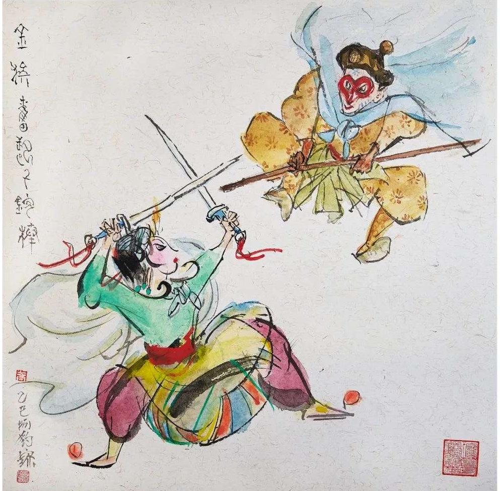 周根宝的戏曲人物画,初期受到前辈关良、林风眠的影响。关良将水墨写意与漫画造型融为一体,线条朴实稚拙,注重写意传神与形式语言的幽默感。林风眠的造型高度简化,长于捕捉表情,大多以狂野的直线和曲线描绘出强烈的戏剧场景。这些美学元素经常出现在阿豹的作品中。他喜欢以中国画笔墨为基础的底线。墨线、色块、物理结构借鉴米罗和毕加索的技术,结合西方绘画中的变形、夸张、块面切割、物理组合、色彩排列等技术,打造戏曲张力,逐渐形象化、抽象化,刻意弱化甚至省略对环境的描述,高度简化和特写构图,使人物形象更加丰满突出。墨水的魅力和大量的空白,素描的线条和书法的笔墨表现,增强了线条的表现力。照片上的线条满是纸,却隐约看见刀光闪闪,唇枪舌战,彩墨幻化出激烈的戏剧冲突。