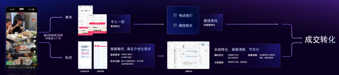过去商家依靠表格收集这个单一的渠道,客户需要从短视频或直播内容跳转到广告页面填写信息,然后品牌主会通过电话回访。这个线性过程比较复杂,有一千个人。而且强制触摸电话往往会给潜在用户带来被打扰的不适,促使沟通在开始前蒙上促销的阴影。