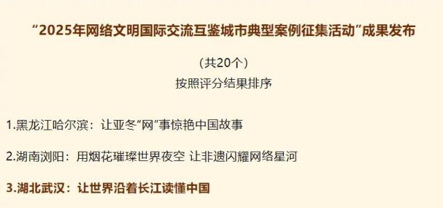 11 网络文明国际交流互鉴分论坛于日举行。 2025 网络文明国际交流互鉴城市经典案例、“网络蒲公英”经典案例、“数字中国机遇”系列短视频等三项成果。其中,湖北省武汉市《让世界沿长江了解中国》当选城市经典案例;黄石广播电台《晶晶乐道说黄石》主持人梁晶、湖北广播电视台主持人刘雅琛当选“网络蒲公英”经典案例。