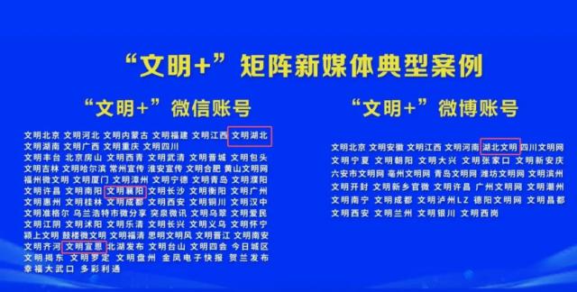 在 10 在日本举行的党的创新理论网上传播分论坛上,中国精神文明网发布了“文明网”+“矩阵新媒体经典案例,现场展示 100 家"文明+"矩阵新媒体经典案例帐号," 文明湖北 "" 文明襄阳 "" 文明宣恩 " 当选"文明 ""微信帐号," 湖北文明 " 当选"文明 “微博帐号。