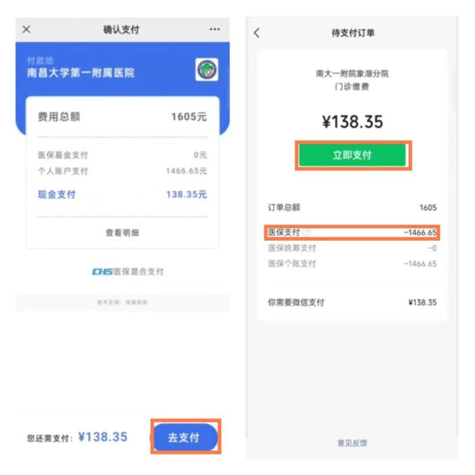 第五步:医疗保险电子凭证授权成功后,进入【确认支付】页面点击【支付】,在待支付界面查看是否使用医疗保险支付,选择【即时支付】。