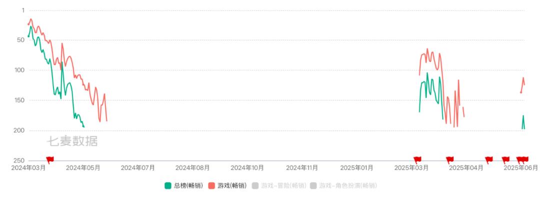 平心而论,这款游戏仍保持着非常出色的长尾发挥,要稳定在App上。 Store游戏畅销榜30人左右并不难。但与当时“超级爆款”的行业预期相比,其后续表现并未能支撑高预期,2024年大幅下滑。