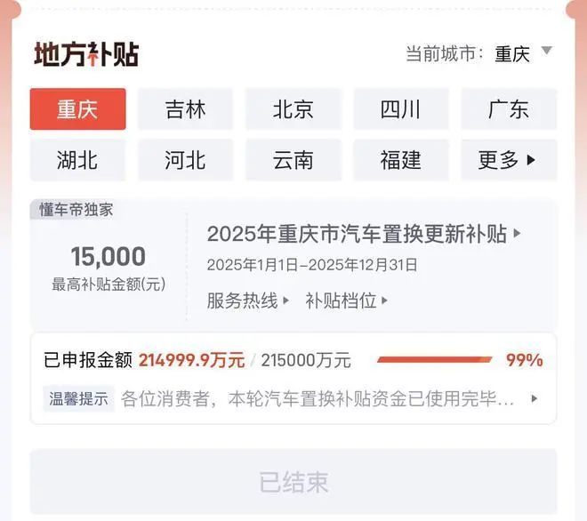 以重庆为例,2025年汽车置换更新补贴无上补贴1.5万元,目前已申报金额达到21.5亿元。在首批资金有限的情况下,如此巨大的资金支出很快导致补贴资金短缺,不得不暂停补贴受理。