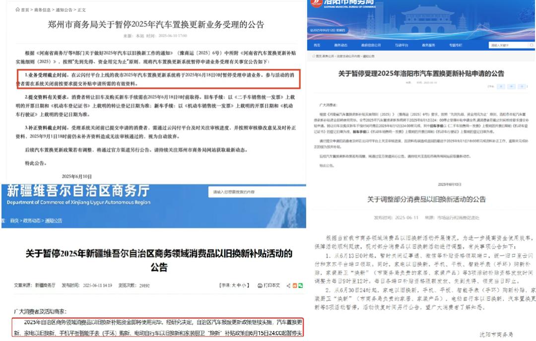 首先,河南郑州、洛阳、许昌等地相继发布公告,宣布暂停申请汽车置换补贴。其中,郑州于6月18日0时暂停,洛阳于6月12日24:6月13日中午12点,许昌停止受理,关闭申请入口。
