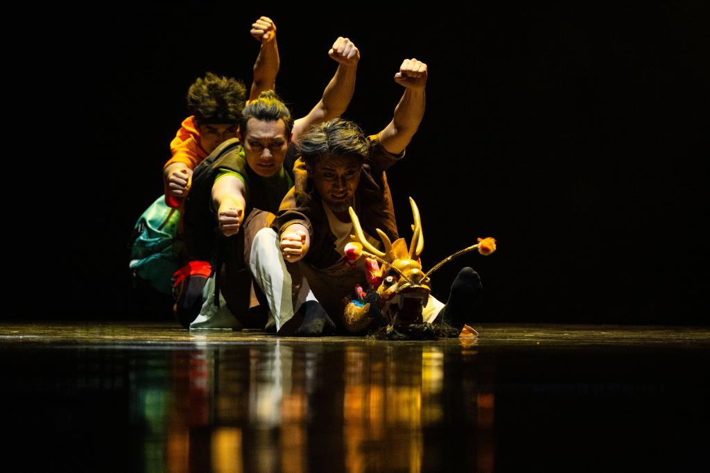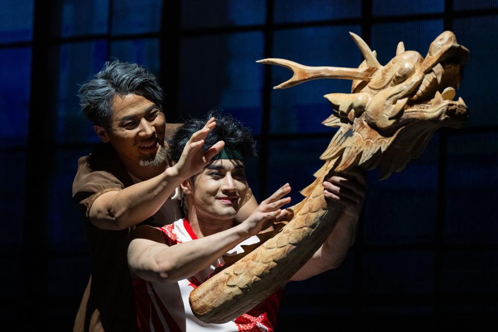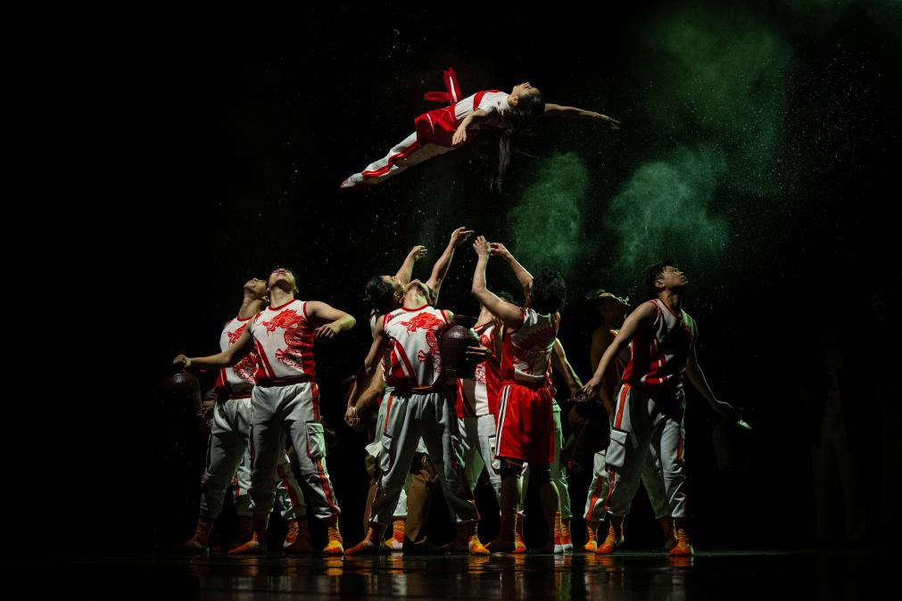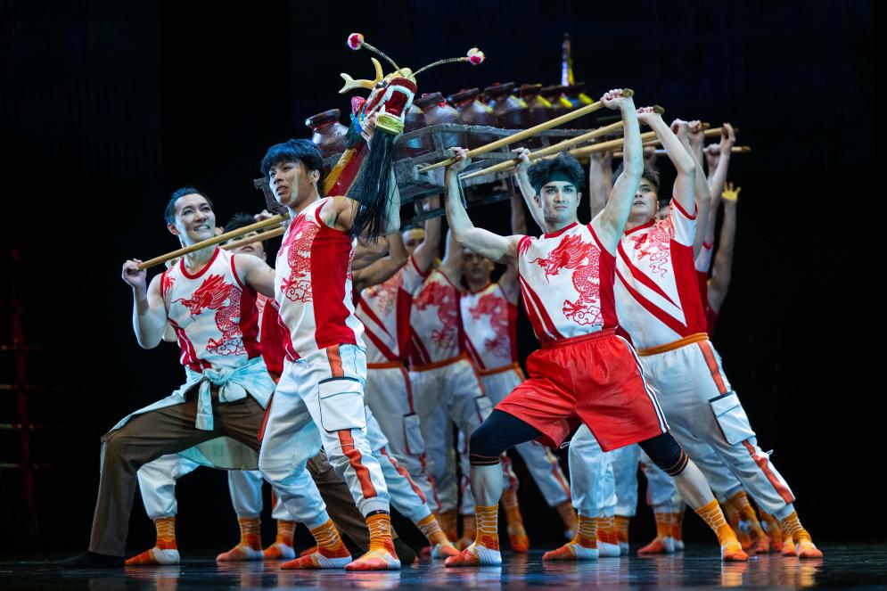 六月十四日,演员们正在表演大型现代舞剧《龙·舟》。新华社 (张金加摄)