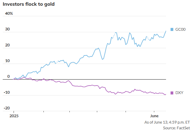 自4月份关税事件以来,对长期“卖美国”交易的焦虑已经蔓延到全球市场。虽然ICE美元指数上周五略有上涨0.3%,但今年至今仍比去年同期下跌9.5%。很多业内人士表示,以色列袭击伊朗后,美元对主要非美元货币只是温和上涨,这进一步强化了美元作为世界避险货币地位正在减弱的迹象。