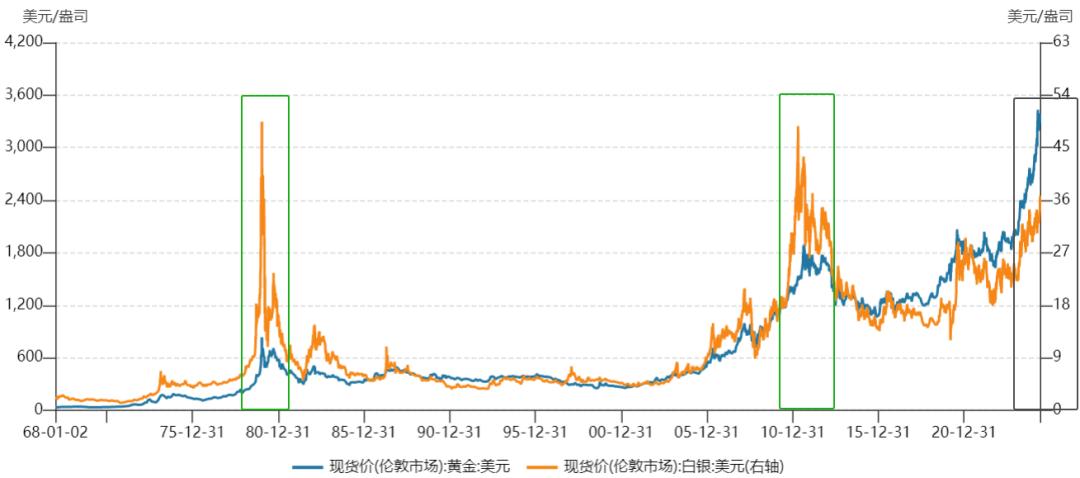 (黄金数据对应左坐标轴,白银对应右坐标轴)