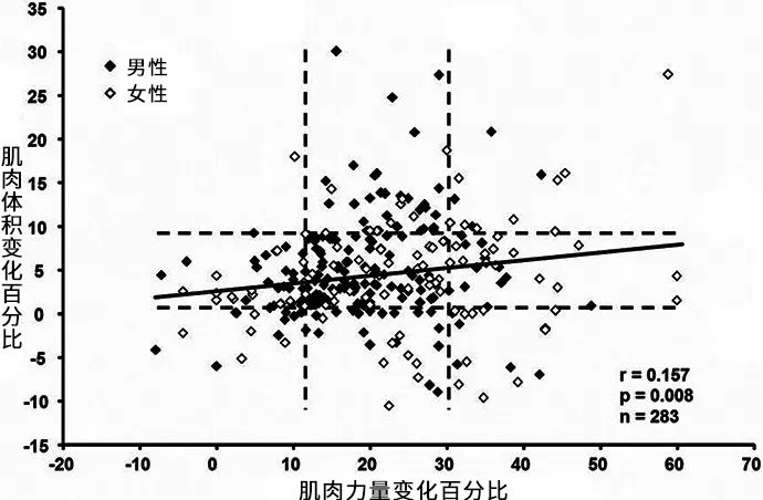 对于同一个人来说,肌肉变大和变强的幅度并不一致。。有研究分析了年轻人训练后的肌肉变化,发现每个人的反应都不一样。大多数参与者的肌肉体积和力量明显增加,有些人的力量明显增加,但肌肉体积几乎没有变化,但基本上没有肌肉明显增加,力量没有增加的情况。