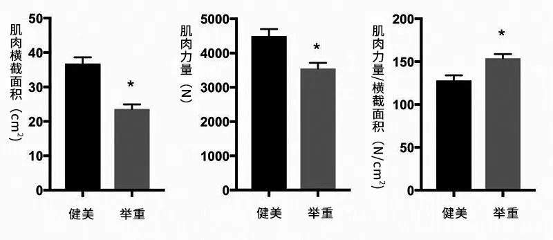 健美运动员肱三头肌横截面积(左图)和力量(中图)的平均值明显大于举重运动员,但力量/横截面积的比例低于举重运动员(右图)。 | 参考资料[1]