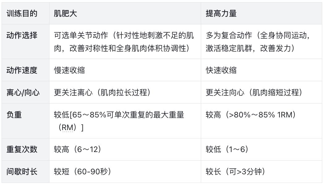 力量方面,与致力于肌肉肥大和肌肉力量的练习相比,差异主要在于动作选择、速度、负荷水平、每组重复次数和组间歇长度。
