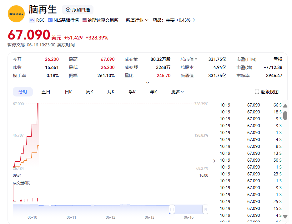 值得注意的是,脑再生开盘后直线飙升,盘中数次融断,截至发稿时,该股涨幅超过328%。