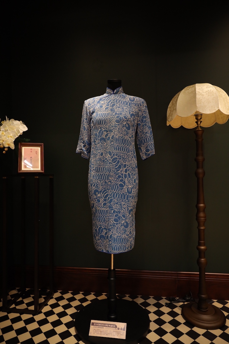 展览现场 蓝色几何纹丝丝印花中袖旗袍 收藏上海大学博物馆