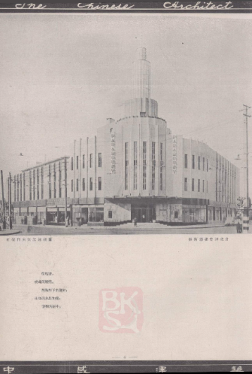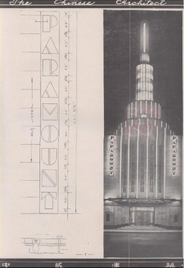 1934年第二卷《中国建筑》第一期上映了百乐门的拍摄和设计图纸。百乐门于1932年竣工,由杨锡的设计。立面向上,耸立的圆柱形灯塔和垂直的彩色灯光闪闪发光,外观和室内设计呈现出典型的装饰艺术风格。