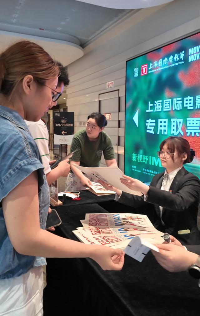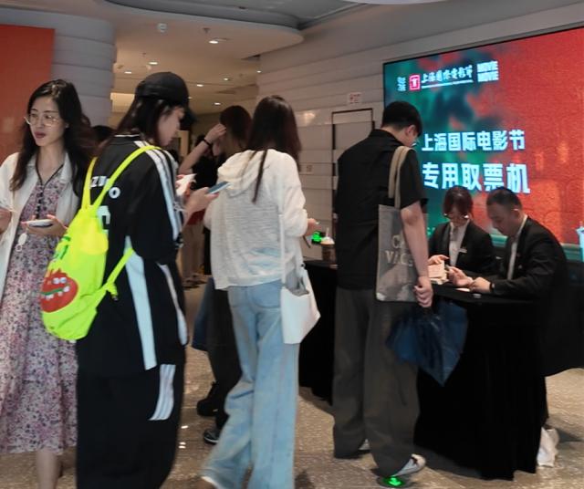票根推高了观影仪式的感觉。在上影节开幕的第二天,记者发现午餐时间刚刚过去, MOViE MOViE 影院推出的“影院纪念票根透卡”已全部兑现。幸运的是,在从专用收票机中取出纸质电影票后,我收到了工作人员分发的专属收票机。 IMAX 收集纪念海报,大堂以电影节主视觉海报为背景的互动装置前打卡拍照的队伍也非常热闹。"影院为《成为齐柏林飞艇》准备了300多张海报,保证人手都有。"现场两名工作人员正在为排队的影迷盖章、发放。“仪式感十足”,20 年迈的陈女人非常高兴。