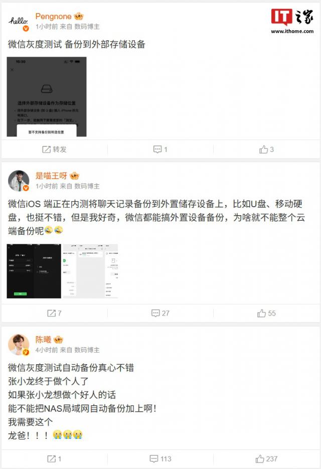 IT 世家 6 月 16 每日消息,据多位客户消息 / 微信,博主分享 iOS 正确的灰度测试全新的聊天记录备份功能,支持电脑、U 各种存储设备,如盘子,可以实现一键备份。