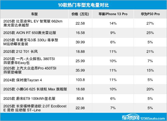 总的来说,比亚迪宋支持苹果和华为的快充协议 L EV、212 T01、上汽大众途昂 Pro 以及小鹏 G6 这个测试环节的表现引人注目,是苹果。 iPhone 13 Pro 和华为 P50 Pro 充电 15 几分钟后,电量达到或超过。 10%。相比之下,华晨宝马 3 系、蔚来 ET9 与长安福特蒙迪欧运动版的综合性能明显不同于其它检测车型,两款手机的充电效率都不高,有优化空间。