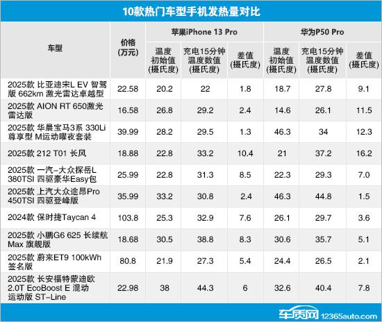 而为华为 P50 Pro 充电时,AION RT 和 212 T01 温差比较高,全部超过 10 ℃。相比之下,蔚来 ET9 对手机充电温度控制的表现更加出色,充电前后的差值仅为 2.1 ℃。另外,华晨宝马 3 系统与上汽大众途昂 Pro 手机充电后的温度低于充电前,前者的温差甚至达到 12.3 ℃。