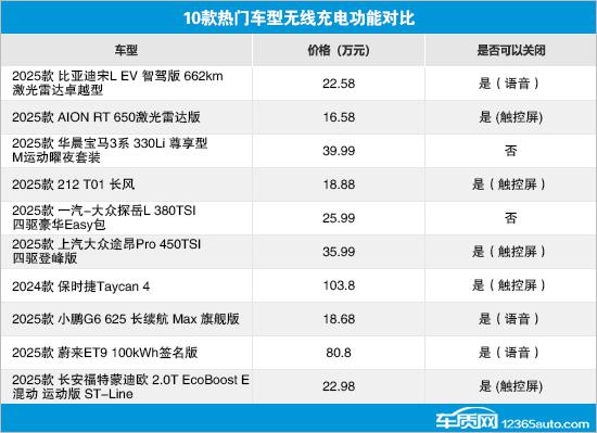 总的来说,这次参加的检测比较 10 比亚迪宋是一款车 L EV 整体表现最为出色, 15 每分钟给苹果手机充电 14%,给华为手机充电 27%,同时手机发热控制也不错,而且还支持开启和关闭语音的方式。上汽大众途昂 Pro 虽然在充电方面的测试成绩略逊于比亚迪宋 L EV,但是在手机发热控制方面表现更好,并且还可以通过触摸屏关闭无线充电功能。相比之下,华晨宝马 3 系统在充电方面表现一般,充电效率低,而且不能关闭无线充电功能。而 212 T01 然后手机的发热控制就不尽如人意了,两款手机充电前后的温差都超过了 10 ℃。值得注意的是,虽然有些车型已经配置好了 50W 无线快充,但在实际使用过程中却受到影响,即使在支持同一快充协议的情况下,充电效率也存在一定差异。