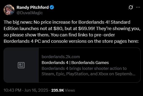 也许是受到老金的启发,2K Games 是国家“无主之地” “4”确定了全球最低价格: