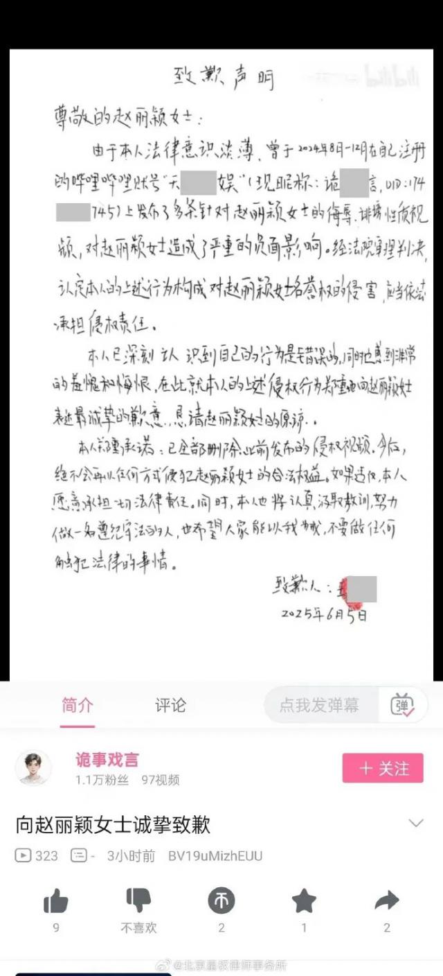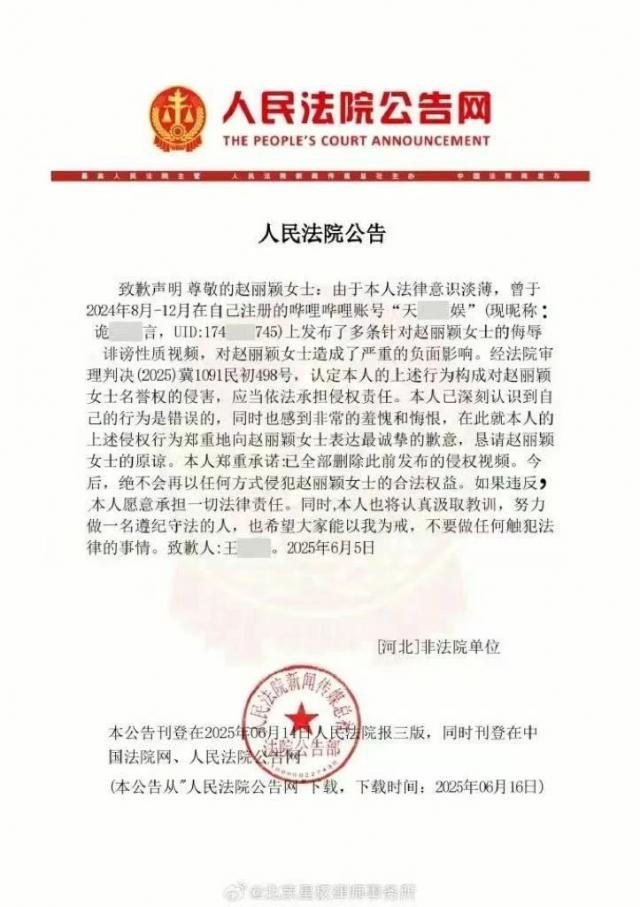 由北京星权律师事务所代理的赵丽颖女性诉王 **(哔哩哔哩弹幕网客户”天天 ** 娱乐,现昵称“诡异” ** 言",UID:名誉权纠纷案174***745,被告王 ** 在《人民法院报》及涉案哔哩哔哩弹幕网帐号中,遵循起效民事判决书,发表道歉声明,向赵丽颖女性公开道歉。