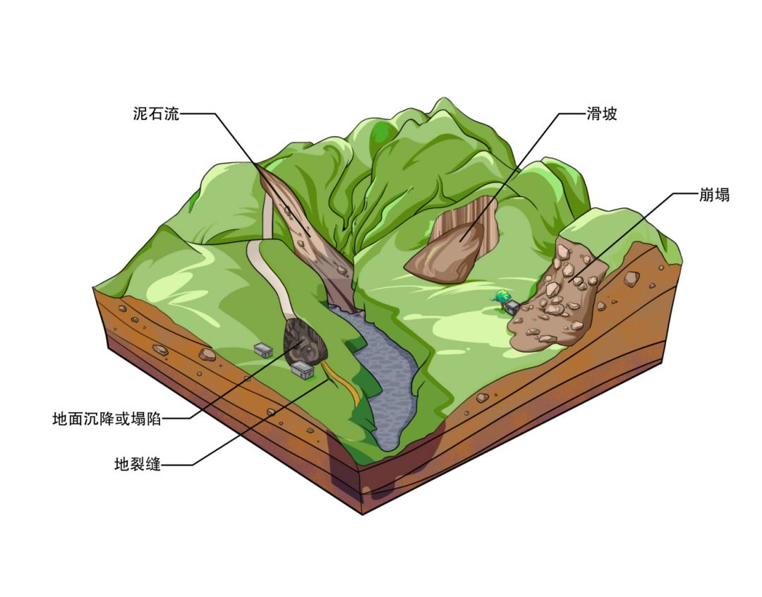 地质灾害:是指与地质作用相关的灾害,如坍塌、滑坡、泥石流、地面塌陷、地裂缝等。,由自然因素或人为活动引起,危害人民生命财产安全。