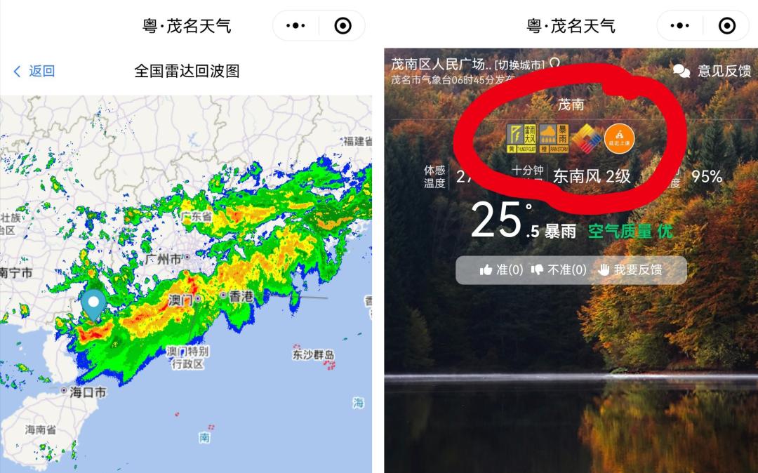 您可以通过“茂名天气”微信微信官方账号或#五颜六色的微天气#小程序查询您所在地区的预警效果和暴雨预警的最新动态。