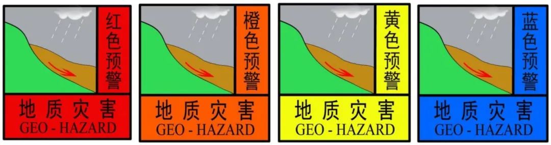 地质灾害气象风险预警分为四个等级:红、橙、黄、蓝,对应的地质灾害风险极高,风险高,风险大,有一定风险。