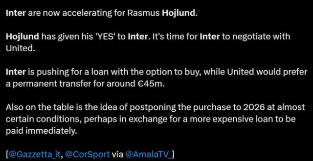 据意大利消息人士透露,曼联对永久销售霍伊伦德更感兴趣,并希望得到它。 3400 万英镑到 3800 一万英镑。然而,国际米兰似乎无法一举支付如此高的价格。他们更倾向于签订包含买断条款的租赁合同,具体来说就是下赛季的租赁。 2026 每年买断责任。