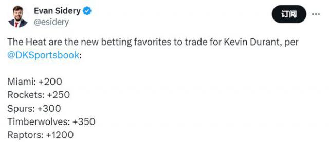 北京时间 6 月 17 日,随着 NBA 随着选秀大会的临近,杜兰特的交易谈判也在如火如荼地进行。KD 最新的下家赔率显示,热火( 200)已升至第一,成为头号热门。,排在第 2-5 依次是火箭( 250)、马刺( 300)、森林狼( 350)、猛龙( 1200)。