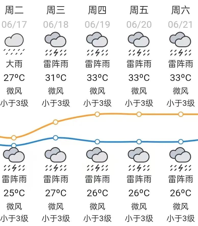 六月十八日至二十三日,阴天为主,下午偶有雷雨,天气越来越热。